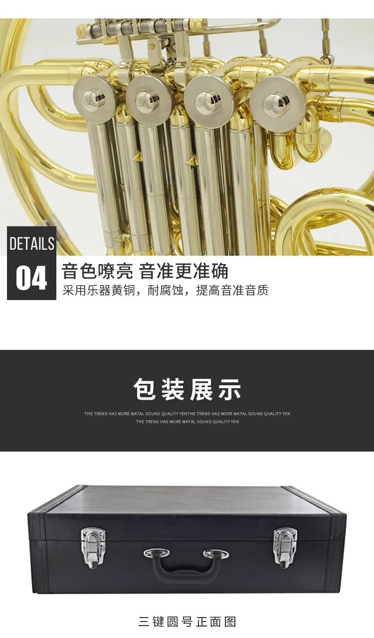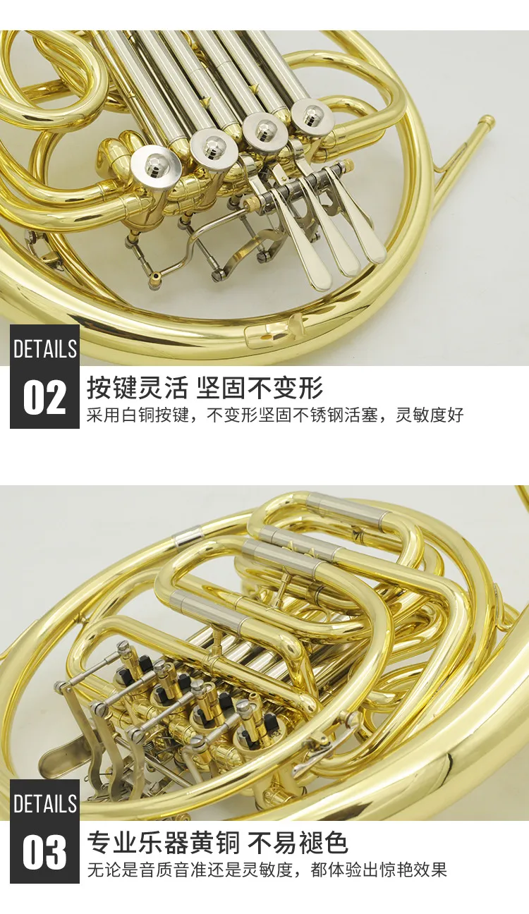 This B♭ French horn features 4 smooth rotary valves and a classic gold lacquer finish, offering improved intonation control, extended range, and a warm, balanced tone. Designed for music schools, band programs, and distributors, it is ideal for students progressing beyond entry level and ensemble performance.